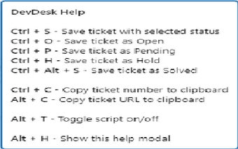 DevDesk é uma extensão do Chrome projetada para otimizar a eficiência na gestão de tickets no Zendesk. Com uma série de atalhos de teclado, o usuário pode rapidamente salvar tickets em diferentes status, como Aberto, Pendente, em Espera e Resolvido, utilizando combinações de teclas simples como Ctrl + S e Ctrl + O. Além disso, a ferramenta permite copiar números e URLs de tickets para a área de transferência com apenas alguns cliques, facilitando a comunicação e o acompanhamento dos atendimentos.